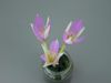 Samenvatting kleur: licht blauwviolet 76A met wit 155A. Binnenzijde: keel geelgroen 2D, naar de top toe eerst wit 155A, dan licht blauwviolet 76A en uiterste topje wit 155A. Helmdraden geelgroen 1B/C, basis geeloranje 14A. Stuifmeel geeloranje 14A. Stijl wit 155A. Stempel wit 155A. Buitenzijde: buitenste bl.bl. basale helft licht blauwviolet 76A, distaal wit 155A, randen naar binnen gebogen; binnenste bl.bl. licht blauwviolet 76A, topje iets lichter. Bloembuis geelgroen 2C. Geen blad tijdens bloei. |